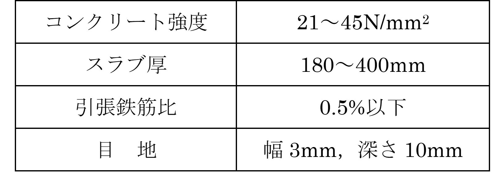 鉄筋コンクリート造スラブは、コンクリートの材料特性である乾燥収縮や周辺部材による拘束等の影響により、表面にひび割れが発生します。ひび割れの発生により、スラブの美観性に加え、建物使用性やコンクリートの耐久性に影響する可能性があり、これらを解消するため、スラブにひび割れ誘発目地を設ける方法が一般に行われています。この従来の目地を設ける方法は、スラブ表面に設けた誘発目地内に収縮ひび割れを発生させて、そのひび割れを適切に処置することにより、スラブの美観性や使用性、耐久性等を損なわないようにするものです。しかし、従来の目地を設ける方法は、スラブのコンクリート表面に適当な深さの目地を形成し、コンクリートを欠き込むだけのため、目地部は他のスラブ断面と比べて脆弱になると考えられています。そのため、構造スラブの設計に用いられるスラブ厚は、全スラブ厚から目地深さを減じた寸法としています。よって、実施工においては、スラブ表面に目地を設ける場合は、その目地深さ厚のコンクリートの増し打ちを行うのが一般的です。しかしながら、スラブ表面に目地を設けるだけでは断面欠損率が少なく、期待しているように目地内にひび割れが入らないのが実情です。