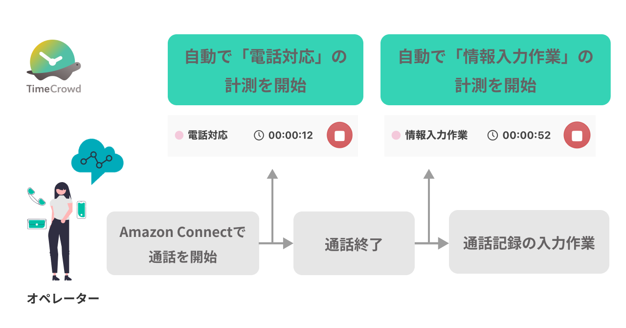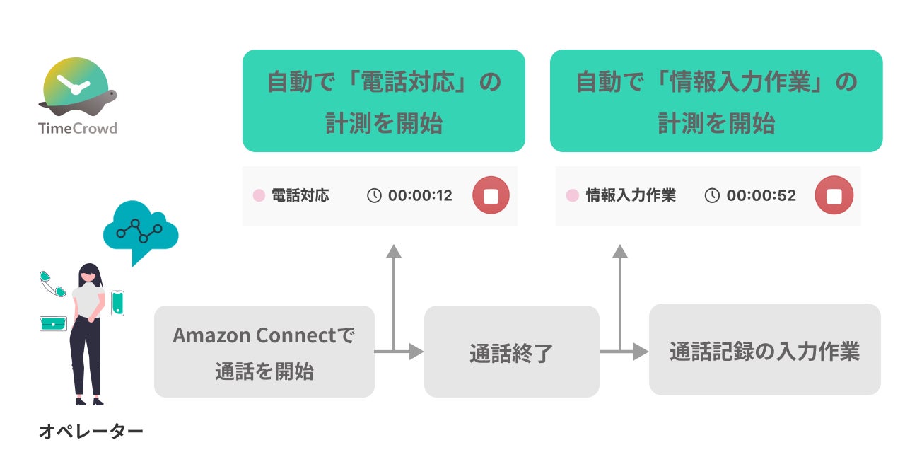 事前にTimeCrowdとAmazon Connectの連携設定をしておけば、オペレーターは通常通り電話業務を行うだけで作業時間を記録できます。