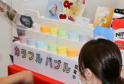 お好みの液体素材と合わせて混ぜるだけでふわふわ泡を作ることができます。 天ぷらのつゆやかき氷のシロップなど一年を通してふわあわ料理をお楽しみいただけます。加熱調理は不要で、出来上がった泡は冷蔵・冷凍保存が可能です。カラフルに色づけした泡は来場者の目に留まりサンプル依頼を多数いただきました。<クールアガーEX>