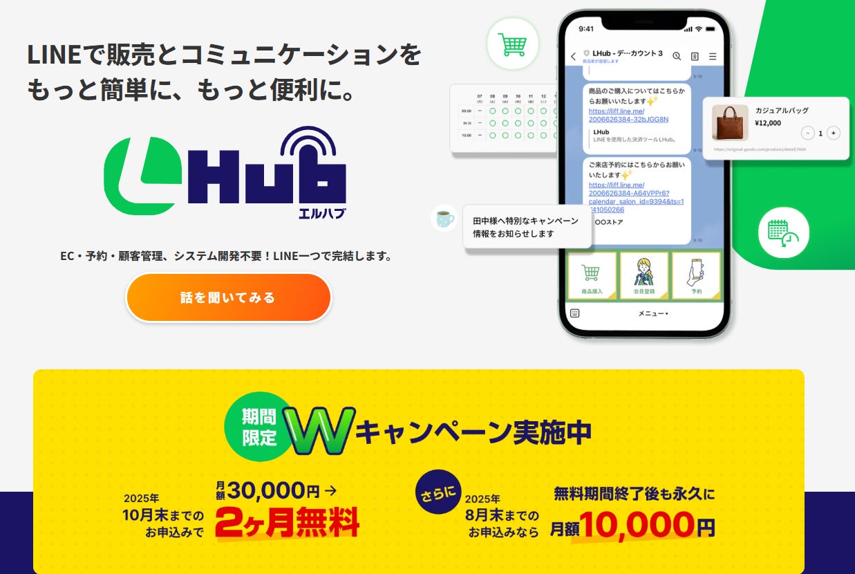 「LHub」は、LINE公式アカウントを活用し、オンライン予約・EC販売・決済・顧客管理・メッセージ配信など、店舗運営やサービス提供に必要な機能を一元管理できるクラウドサービスです。