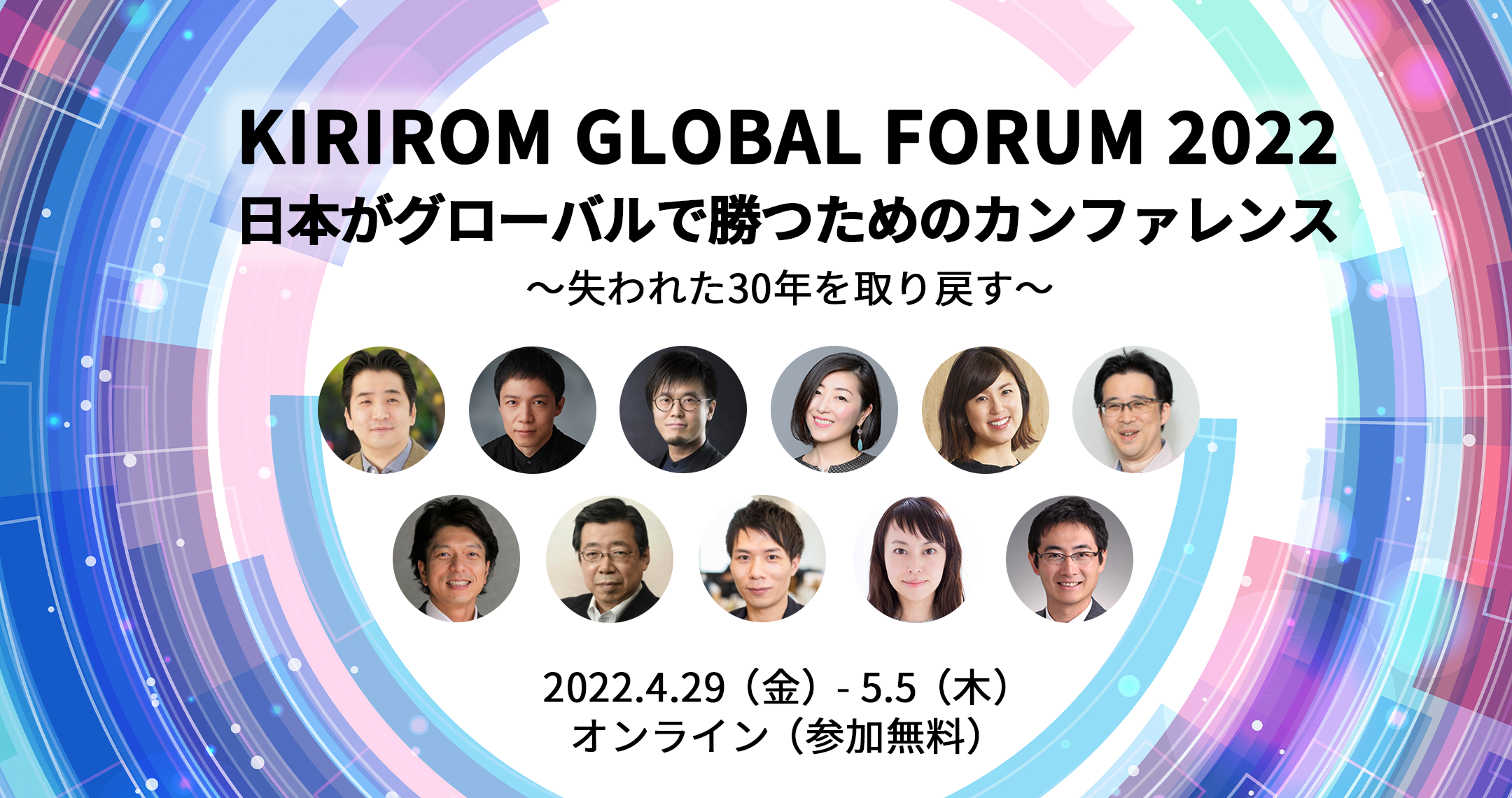 キリロムグローバルフォーラムは、世界中の起業家・投資家・技術者・ビジネスパーソン・教育関係者・政府関係者が国境や業種・業界の垣根を越えて繋がり、日本のグローバル化の課題解決のための議論の場となっています。特に今回は、コロナ禍でいっそう内向きになってしまった日本に、良質な刺激を提供することをコンセプトに置いており、「失われた30年を取り戻す」をテーマに掲げています。