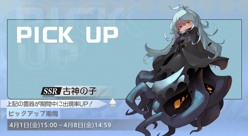 下記の期間中に、霊器ピックアップ祈願を開催いたします。期間中、霊器「古神の子」の出現率がUP!