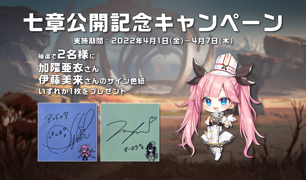 魔女境界ストーリーの7章開幕を記念して、アンドレア役の声優を務める加隈亜衣さんと、オーロラ役の伊藤美来さんの色紙が当たるキャンペーンを実施します。詳細は以下をご覧ください!
