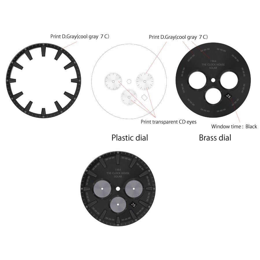 電池交換が要らないソーラーウォッチは、その特性上文字盤に光を通す必要があるため一般的に全面にプラスチックダイヤルが採用されています。本モデルは ザ・クロックハウスオリジナルソーラーウォッチで初めて金属ダイヤルを採用。 プラスチックダイヤルと金属ダイヤルを組み合わせることでソーラー充電機能はそのままに、これまで表現が難しかった深い色合いと質感を実現しています。