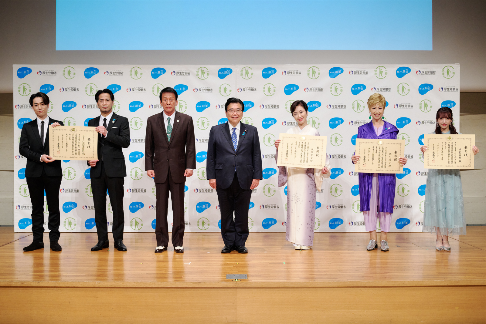 “肝炎対策事業功労者厚生労働大臣表彰”は、肝炎対策特別大使の伍代夏子氏、スペシャルサポーターの瀬川瑛子氏、EXILE HIRO氏・TETSUYA氏、AKB48 向井地美音氏に対して、贈られました。