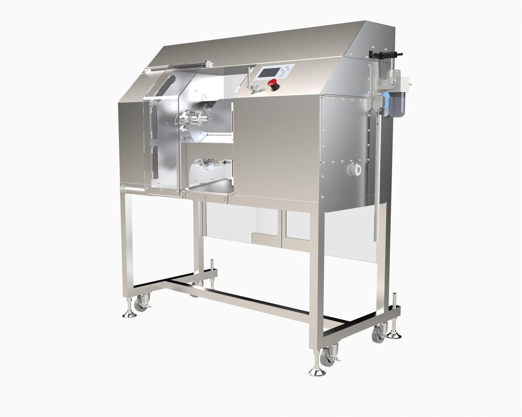 セントラルキッチン・量販向け工場の大量処理に最適。1時間450個、歩留まり約53%。サイズ混在対応(特許申請中)で省人化に貢献
