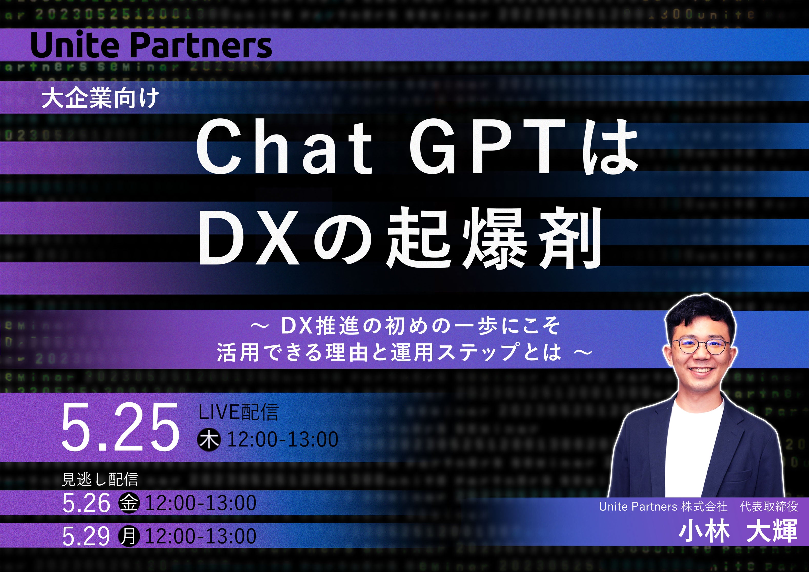 企業の変革パートナーを目指すブティック型コンサルティングファームのUnite Partners株式会社(本社:東京都、代表取締役:小林大輝)は、2023年5月25日(木)に、「ChatGPTはDXの起爆剤〜 DX推進の初めの一歩にこそ活用できる理由と運用ステップとは 〜」と題して大企業のDX担当者向けのセミナーを開催します。