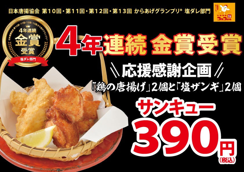 応援いただいた全ての皆さまへ感謝の気持ちを込めて、金賞受賞の「コッコちゃん塩ザンギ」と「名物!唐揚げ」の合盛り4個セットを390円(サンキュー)価格で販売致します。