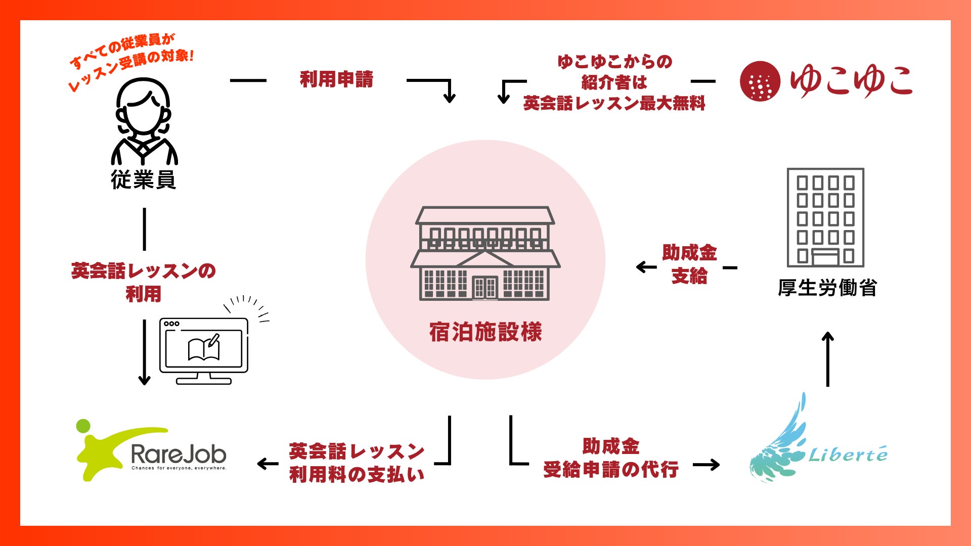 「レアジョブ英会話 ビジネス英会話コース」を受講する場合、プログラムの導入から助成金の申請までワンストップでゆこゆこがサポートします。宿泊施設は申請作業を気にすることなく、安心して受講いただけます。