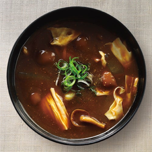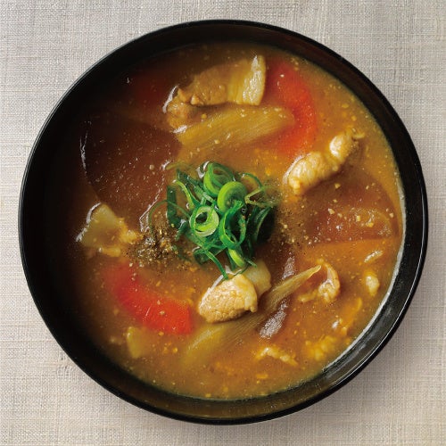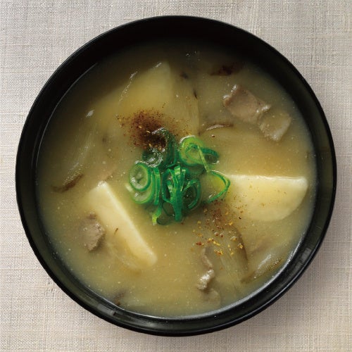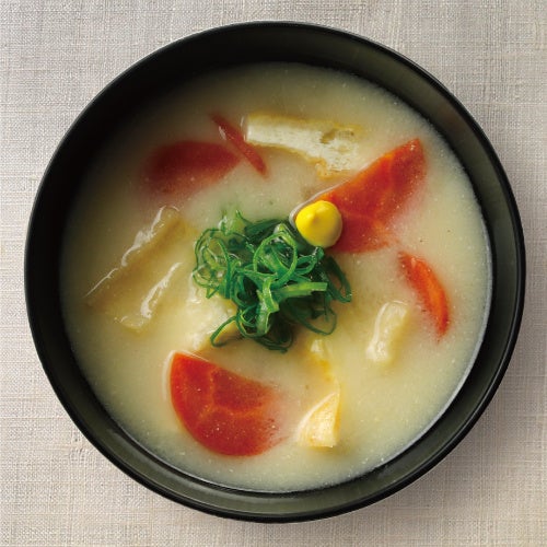 京都 西京味噌の赤だしと麹味噌を合わせました。大豆の香りと米麹由来の甘味が印象的な口当たり。たっぷりと入った食材に、ぴりっと効いた山椒が調和する、贅沢な味わいをご堪能ください。
