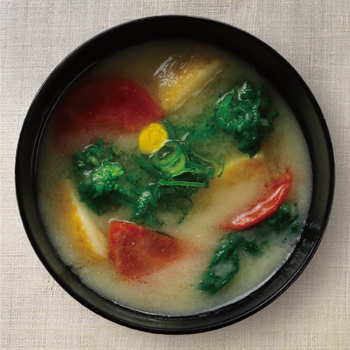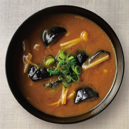 京都 西京味噌の赤だし味噌は、熟成された香りと風味が特長。自然な甘さで塩分を控えて作られた白味噌を合わせました。食感の良いえのき茸と、揚げて下味をつけたお茄子に、美味しさが染み渡ります。