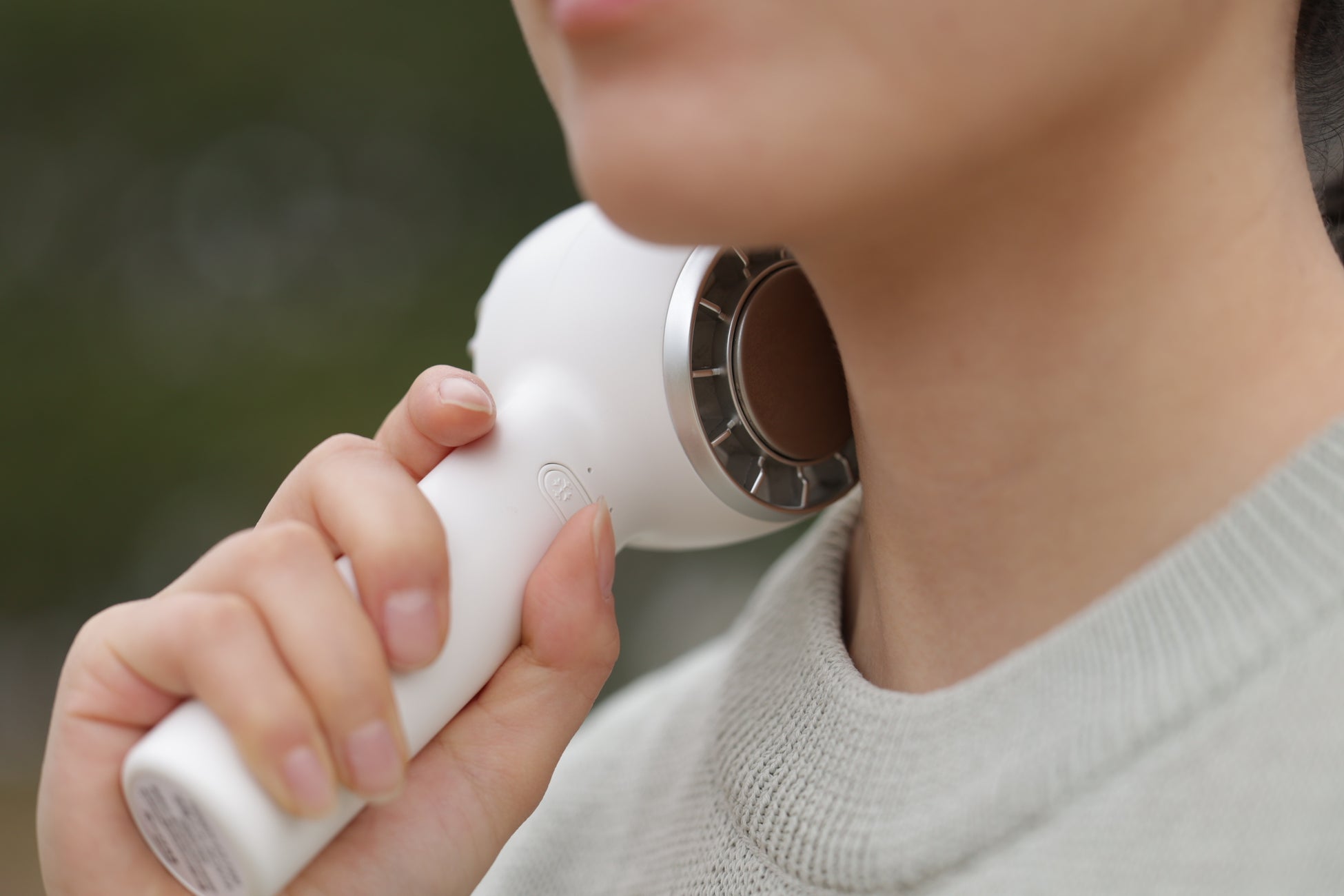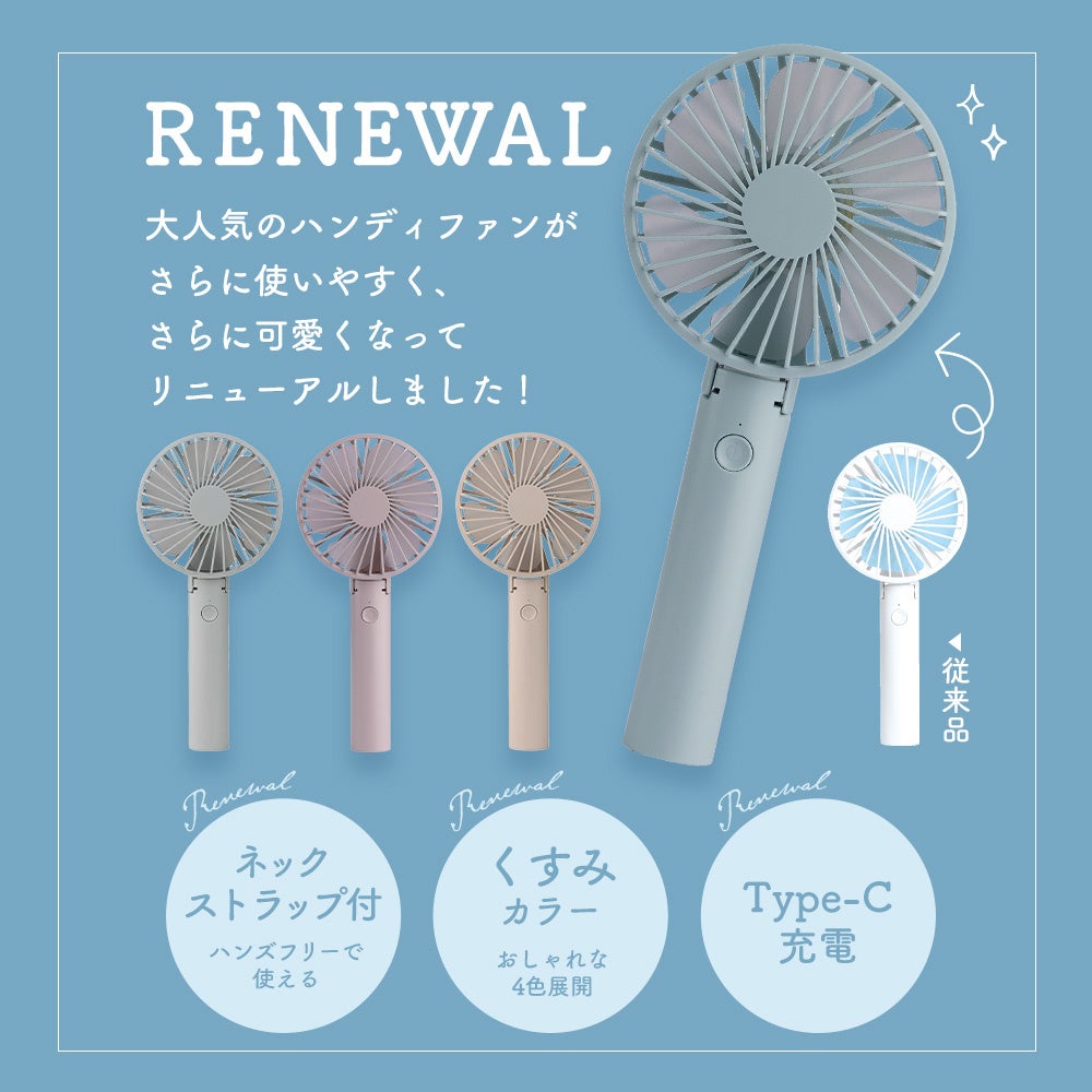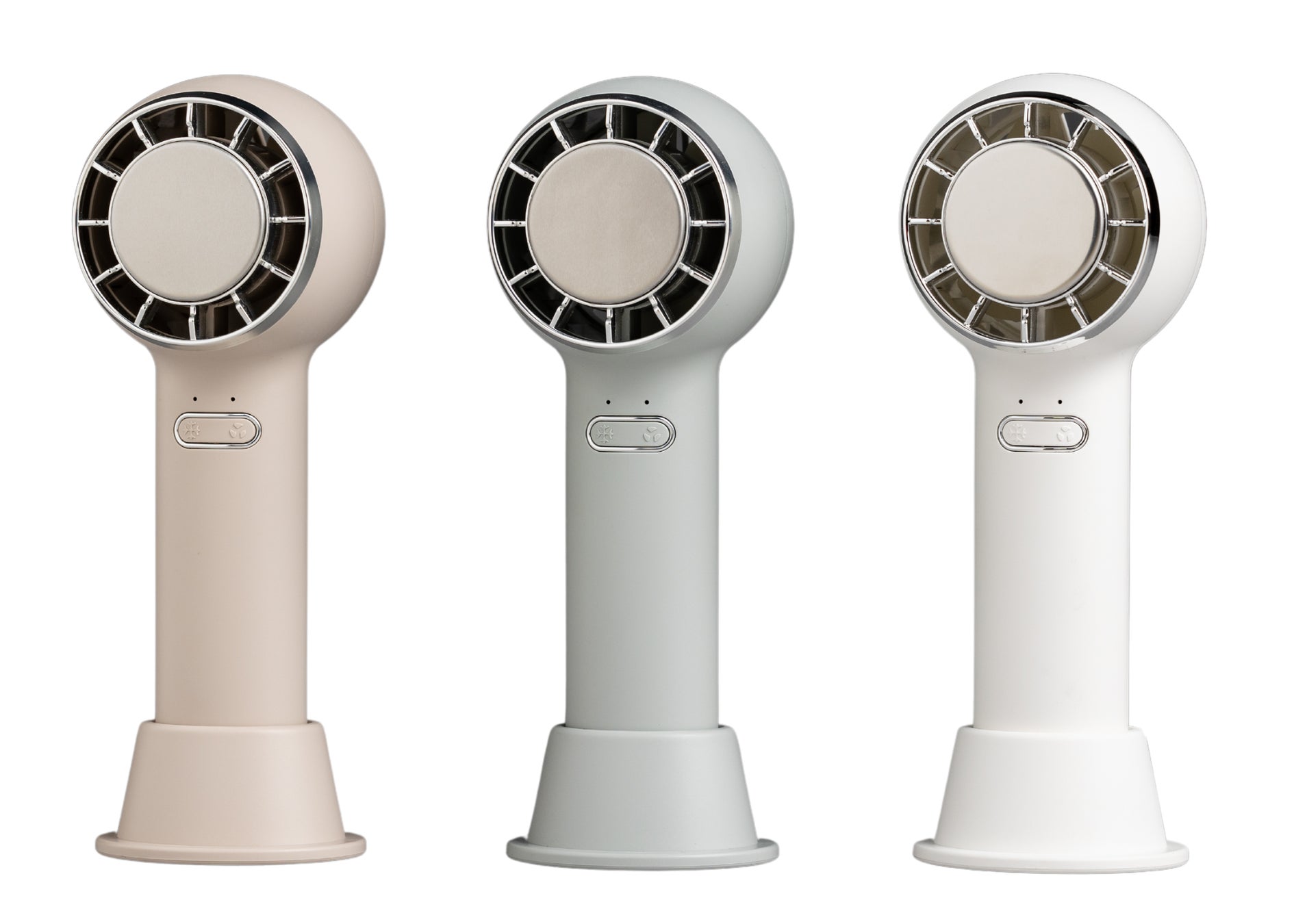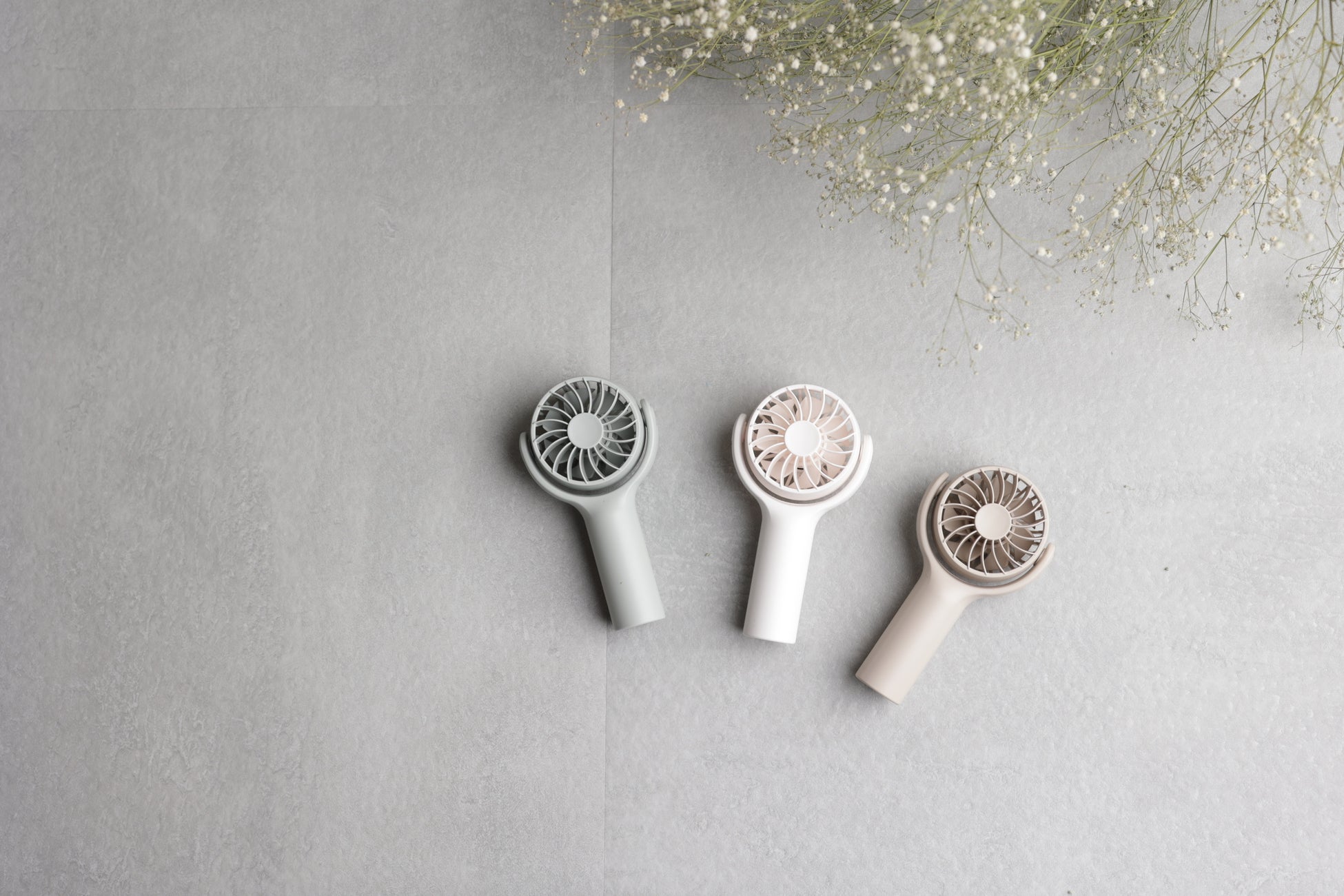 シリーズ累計50万台突破!(※当社調べ)の、弊社定番商品をさらに使いやすくリニューアルしました。 低価格ながら、手持ち、首掛け、卓上の3つの使い方が可能です。5段階の風量調節機能は、場所やシーンに合わせて自在に調節ができます。さらに、優しいニュアンスカラーの4色展開(ベージュ、グレー、ピンク、ミントブルー)で装いに合わせてお選びいただけます。