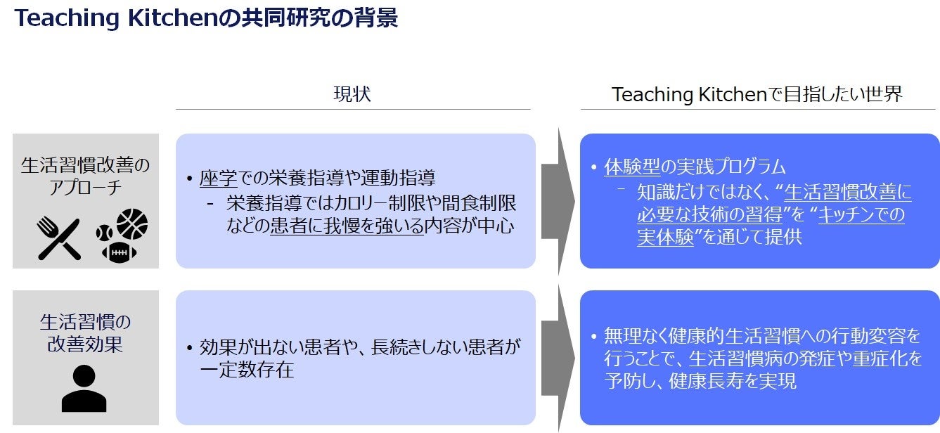 これまで、肥満や糖尿病の治療を目的とした生活習慣改善指導は、座学で行われる栄養指導や運動指導が中心でした。しかし、本プログラムでは、患者やその家族が「知識だけでなく、生活習慣改善に必要な技術を習得すること」に焦点を当てています。プログラムの最大の特徴はこうした技術の習得を全て”キッチンでの実体験”を通じて行うこと。例えば、食生活に関しては、最新の栄養学のエビデンスに基づく座学に、調理実習と試食を組み合わせ、実践的な食生活改善技術を習得するところまでを目指します。同様のアプローチを、身体活動やストレス軽減に対しても行い、座学のみではなかなか身につかない生活習慣改善に必要な技術の習得を可能にするプログラムを目指します。