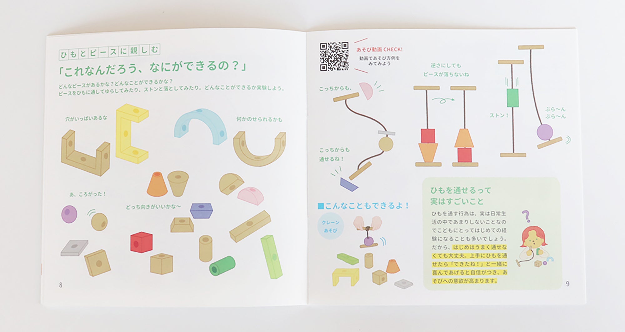 ひもを通す方向を変えたり、ピースを組み合わせて長いひもにしたり・・遊ぶ度に新たなひもの通し方を発見することができます。