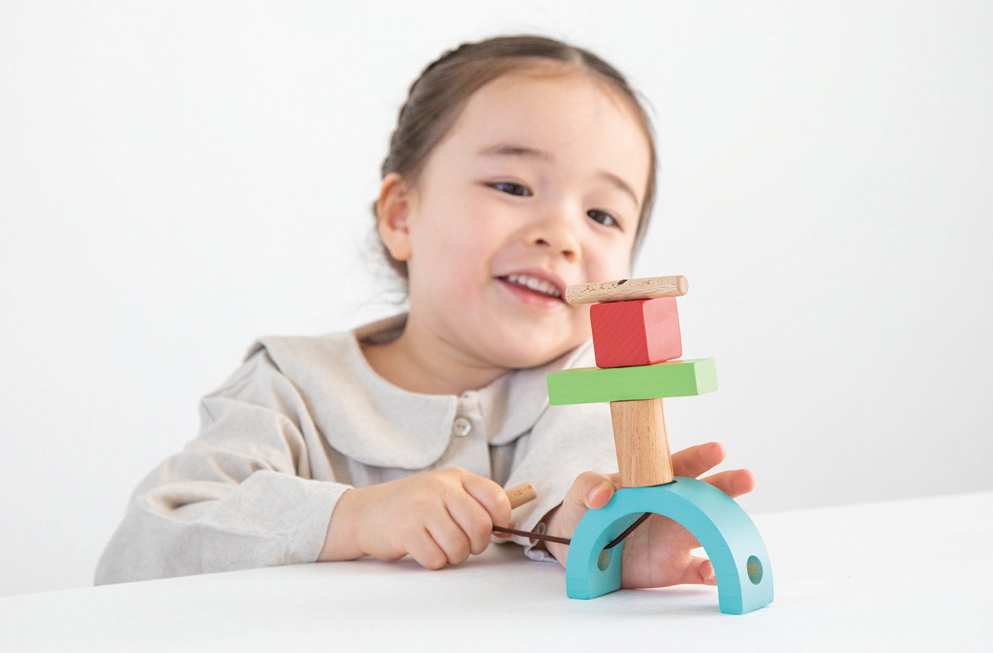ひもの両端についている棒は、どちらの端からもピースを通すことができ、通したピースがひもから抜け落ちることを防ぐストッパーにもなります。あそんでいる最中にピースがひもから抜け落ちることがないので、自由に持ち歩いたり動かしたりする新しいあそびが楽しめます。