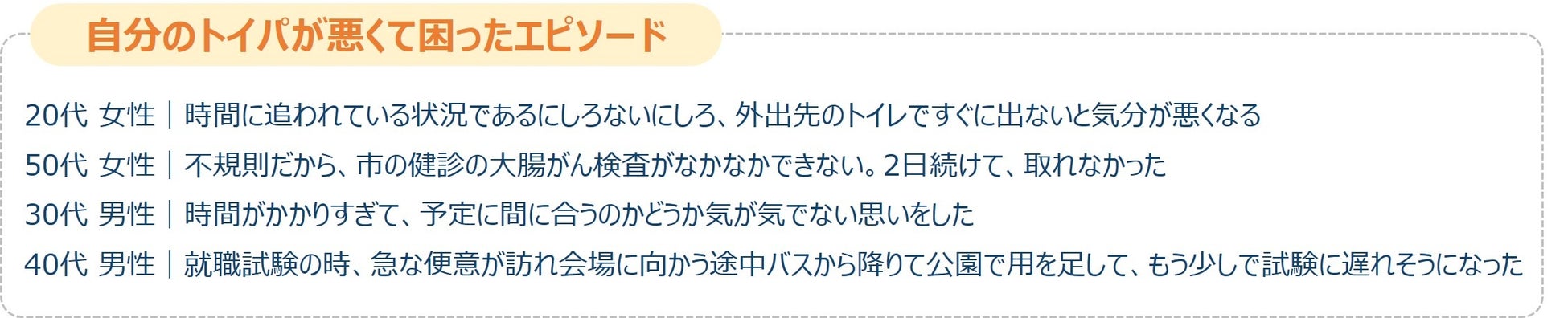 今回の調査から、トイパが悪いと感じている人が予想以上に多いことがわかりました。トイパの良し悪しを判断する基準は「排便にかかる時間」「排便後の気分」「排便の成果-カタチ」「排便の成果-ニオイ」の4つです。トイパが悪い人は、便秘やスッキリ感に問題を抱えているだけでなく、トイレに時間がかかることで「約束に遅れないか心配」「旅行中もトイレが気になる」といった悩みまで増えてしまうようです。