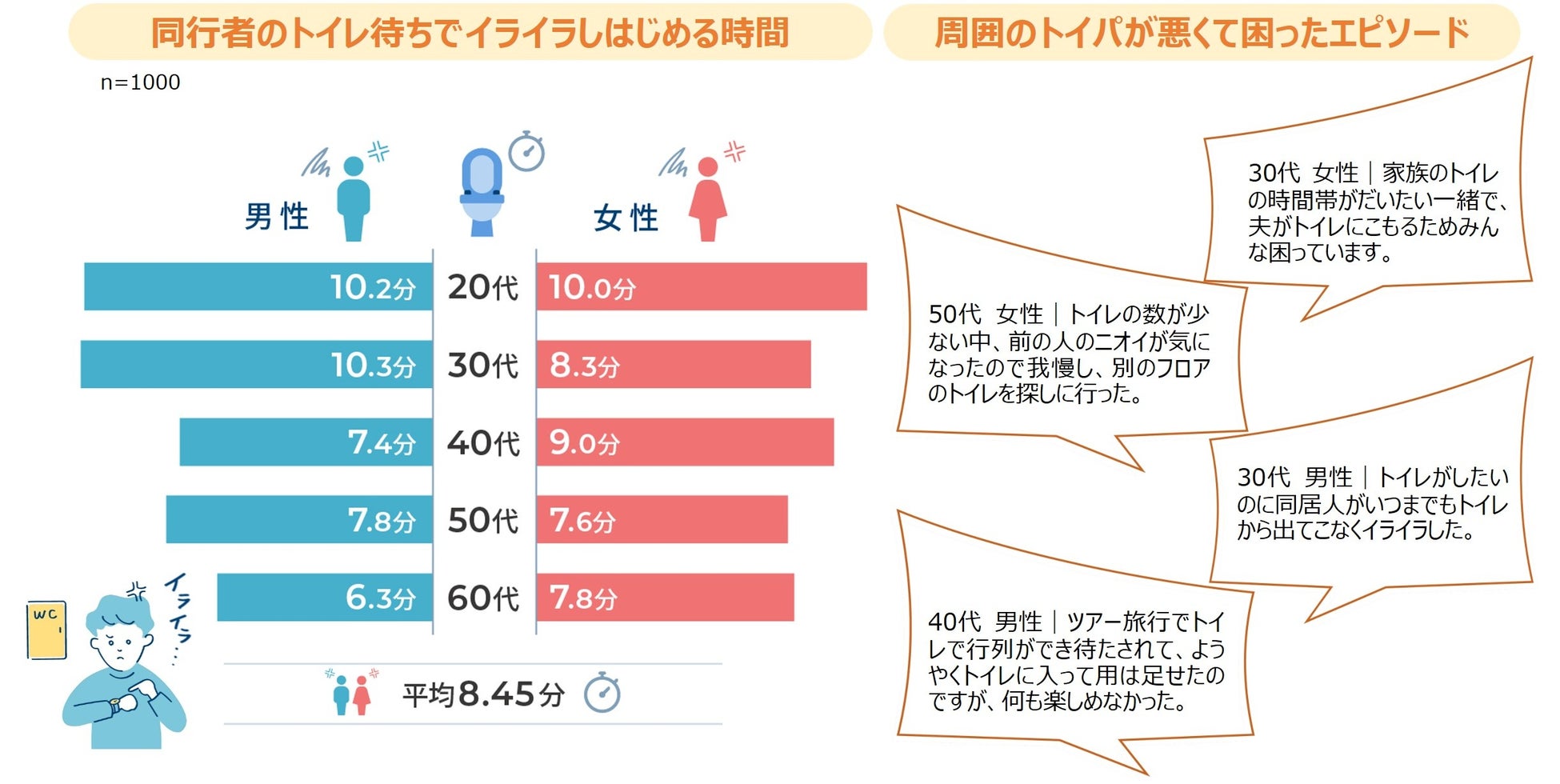 トイパの指標のひとつであるトイレ時間が、周りにどう影響を与えるかも聞いてみました。友人や家族と一緒の外出時、同行者のトイレ時間がどのくらいの長さまでなら、気にせずに待てるでしょうか。調査によると、平均で8.45分を越えるとイライラするという結果が出ています。実は若い年代ほど寛容な傾向があり、20代は男女ともに10分程度はイライラせずに待っていてくれるようです。逆に、もっとも短いのは60代男性で6.3分でした。周囲の人との人間関係にも関わってくるのであれば、トイパの悪さを放っておくわけにはいきません。