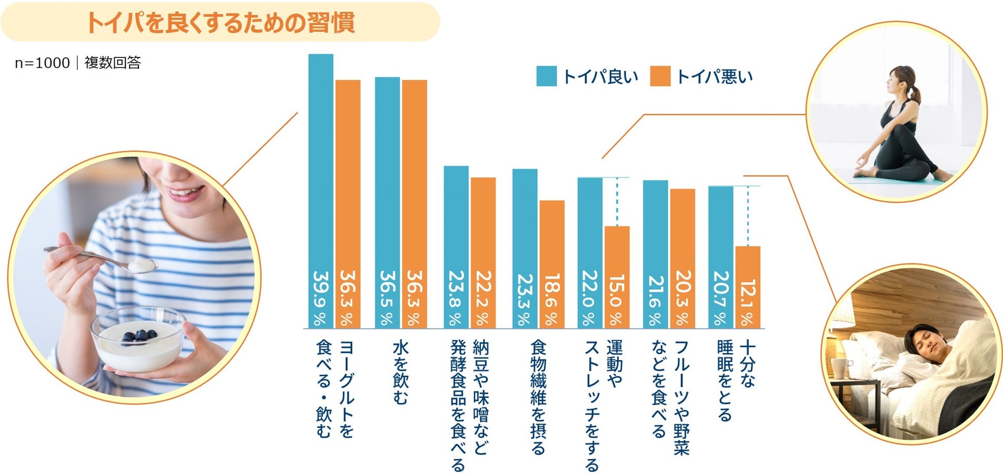 トイパを良くするために習慣にしていることとしては、TOP3が「ヨーグルトを食べる・飲む」「水を飲む」「発酵食品を食べる」、次いで「食物繊維を摂る」など、食事関連の回答が上位にきています。トイパ改善のため腸に良いことを考えたときに、まず食習慣から改善しようとすることが分かります。また総じてトイパの良い人の方が、「運動やストレッチ」「十分な睡眠」など、食事以外も含めた多くの習慣を取り入れている傾向が見られました。