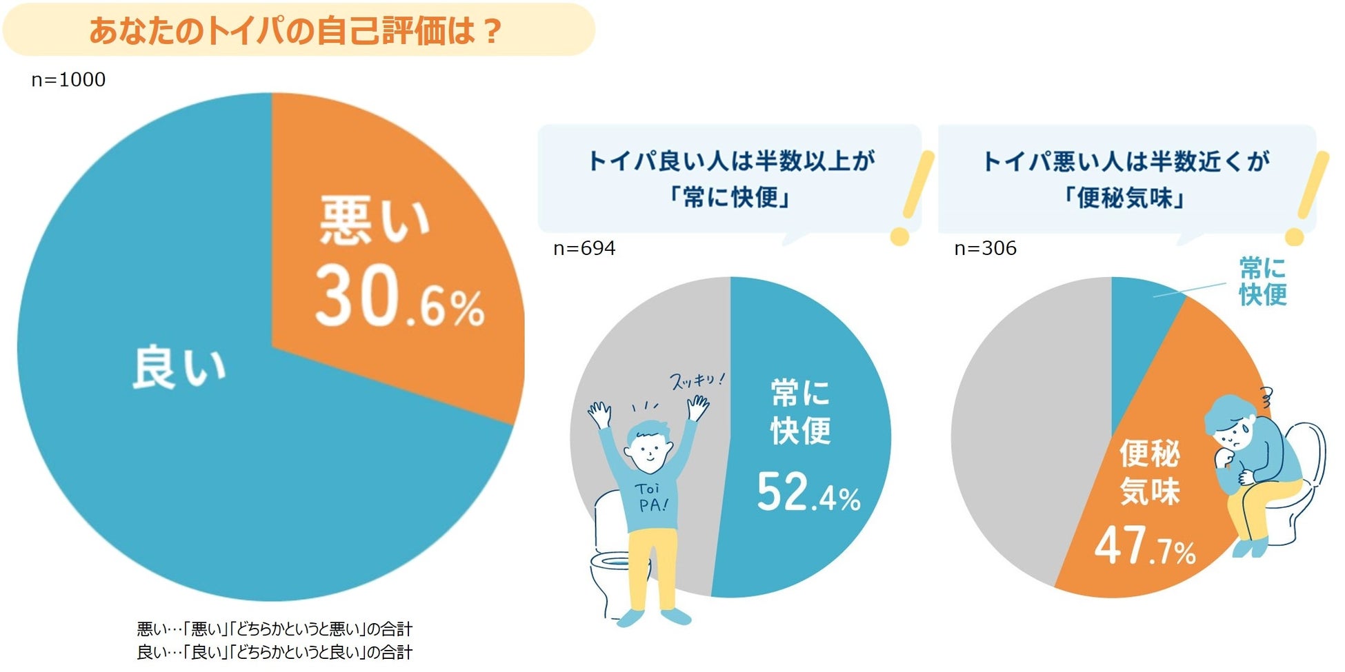 普段のトイパを、時間・気分(スッキリ感)・成果(便のカタチやニオイ)などを総合的にみて自己評価してもらったところ、3割の人が自分のトイパが「悪い」「どちらかというと悪い」と評価していることがわかりました。平常時の排便状況については、トイパの良い人は「常に快便」が約半数であるのに対して、トイパの悪い人は約半数が「便秘気味」と回答しています。