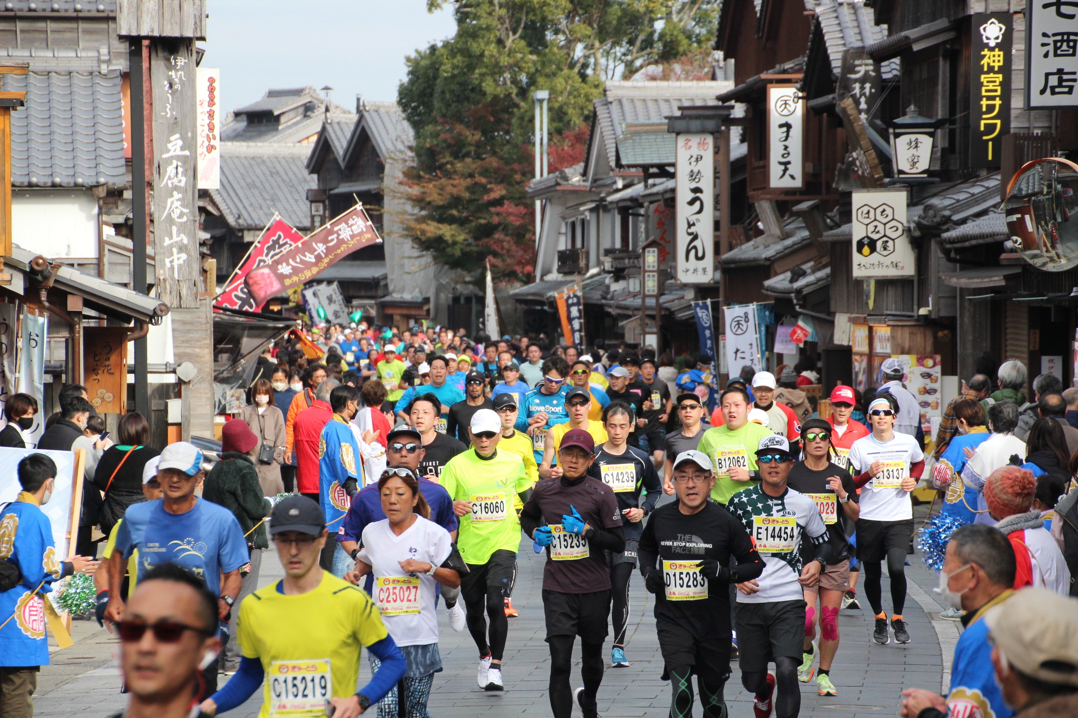 伊勢が誇る観光名所である「おはらい町」や普段走ることのできない自動車専用道路である「伊勢二見鳥羽ライン」を走ることができる、魅力満載のマラソン大会!