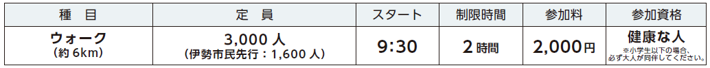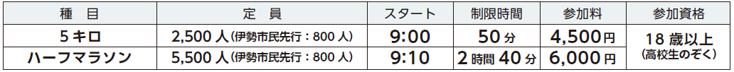 「ウォーク」「バリアフリーラン」「5キロ」「ハーフマラソン」のどの種目に出場していただいても、【お伊勢さんマラソンタオル、赤福餅2個、お伊勢さんチケット(500円分)、ドリンク、ポリティバッグ】がもらえる豪華参加特典をご用意しております。