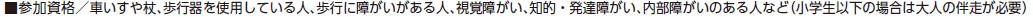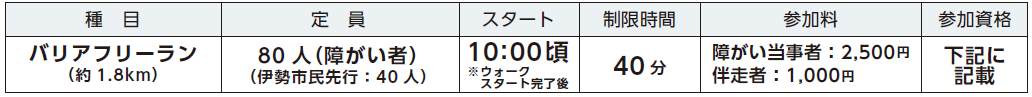 約1.8kmのサンアリーナ周辺の特設コースとなります。参加対象者は、車いすや杖、歩行器を使用している人、歩行に障がいがある人、視覚障がい、知的・発達障がい、内部障がいなどのある人です。ご家族やご友人を伴走者にご参加いただくことが可能となっており、ボランティアによる伴走・サポートの希望も受付しておりますので、問い合わせ先となるNPO法人伊勢志摩バリアフリーツアーセンターにご相談ください。