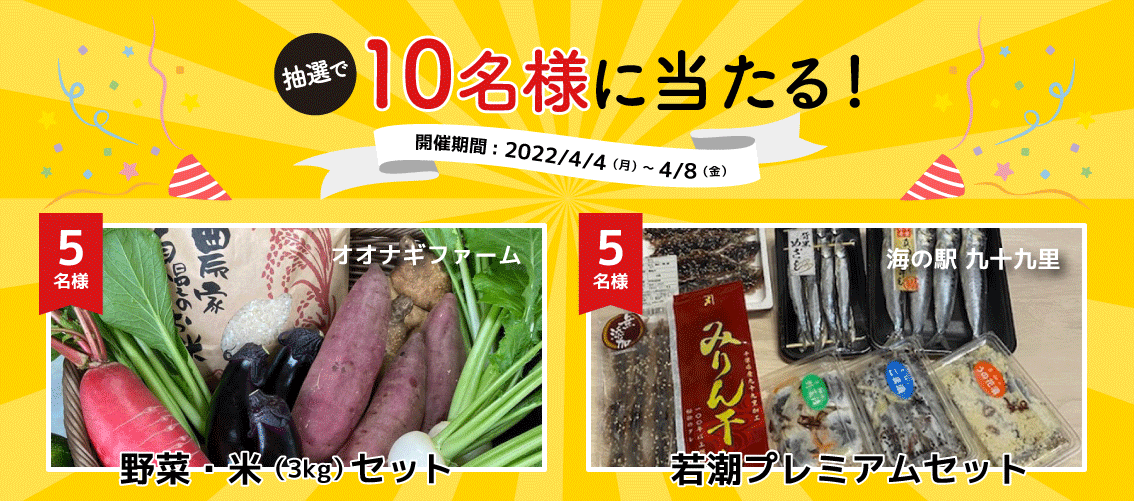 千葉県の産業復興を支援するモール型ECサイト「ありがとねっと」を運営する株式会社ジェス(本社:千葉県成田市 社長:長谷川 直行)は、千葉テレビ放送株式会社(本社:千葉県千葉市 代表取締役社長:篠塚 泉)の『ちば朝ライブ・モーニングこんぱす』(毎週月曜~金曜 朝6:45~8:00) ~今週のプレゼント~ にて、2022年4月4日(月)~4月8日(金)までの期間に応募いただいた方の中から抽選で、ありがとねっとに出店中のオオナギファーム様の「農家直送 野菜・米セット」と、海の駅 九十九里様の「若潮プレミアムセット」を各5名様、合計10名様にプレゼントいたします。