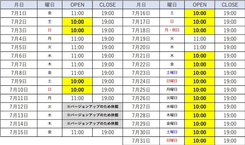 7月は、夏休みシーズンの到来を受けて、土日祝日以外でも営業時間が10時スタートとなる日程がございます。