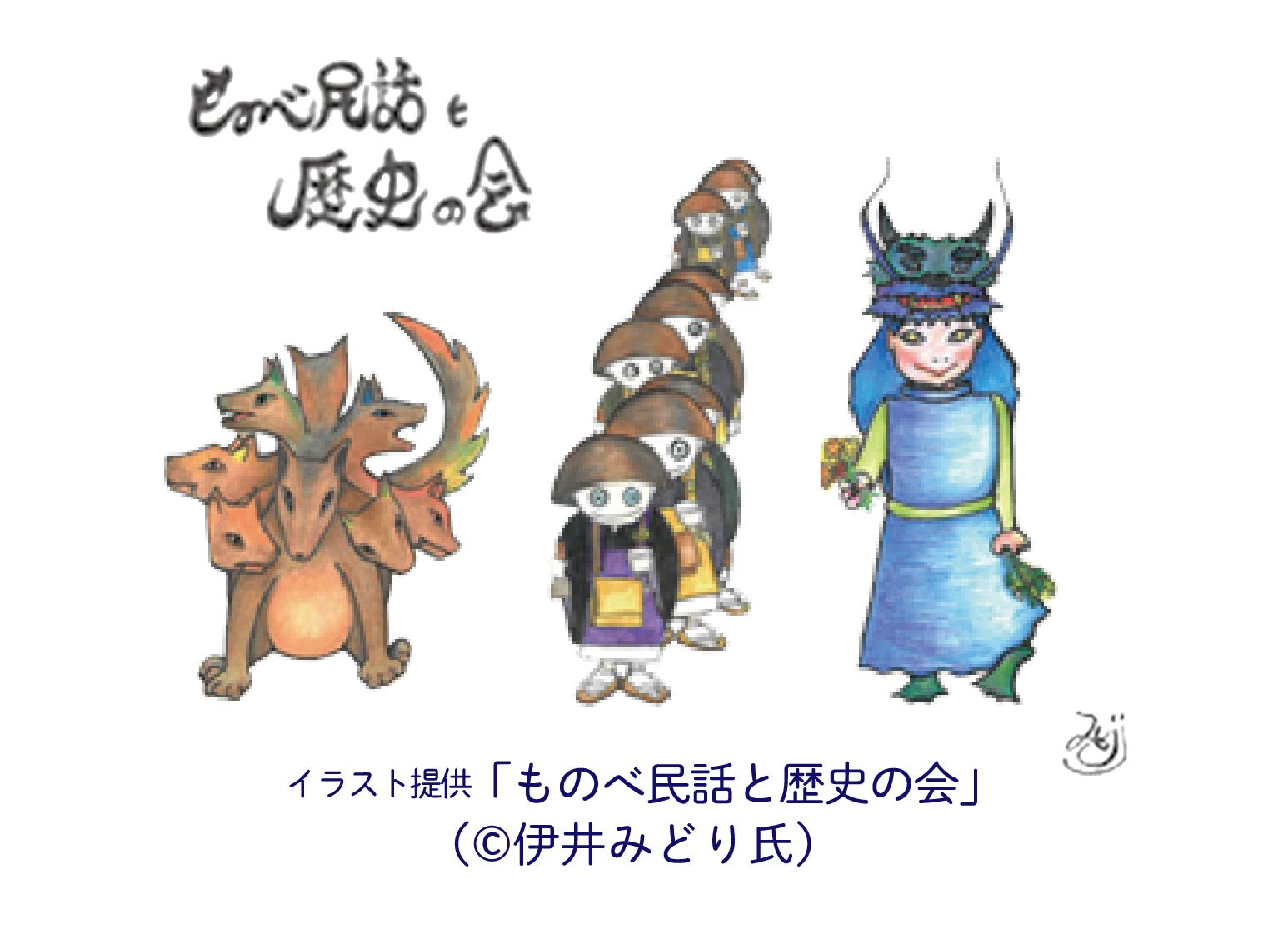 物部に伝わる神や物の怪のイラストで缶バッジをつくります(イラスト提供 「ものべ民話と歴史の会」©伊井みどり氏)