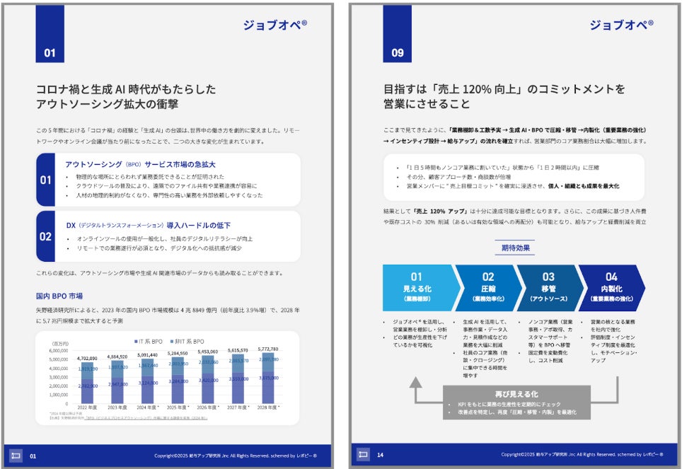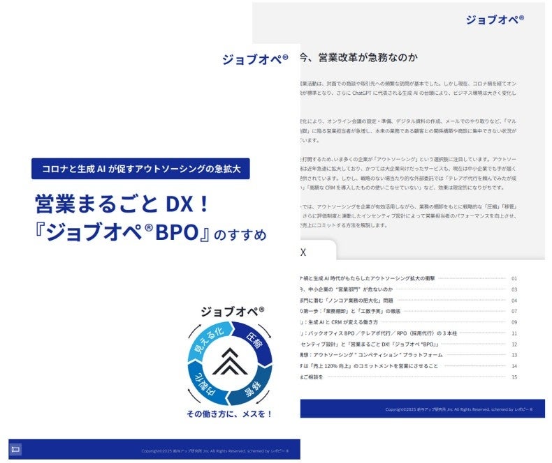 営業まるごとDX!「ジョブオペ®」を展開する、株式会社給与アップ研究所(本社:東京都千代田区、代表取締役:高橋 恭介、以下 給与アップ研究所)は、コロナ禍と生成AI時代における営業改革の方法をまとめた解説ガイド「営業まるごとDX!『ジョブオペ®BPO』のすすめ」を無料公開しました。