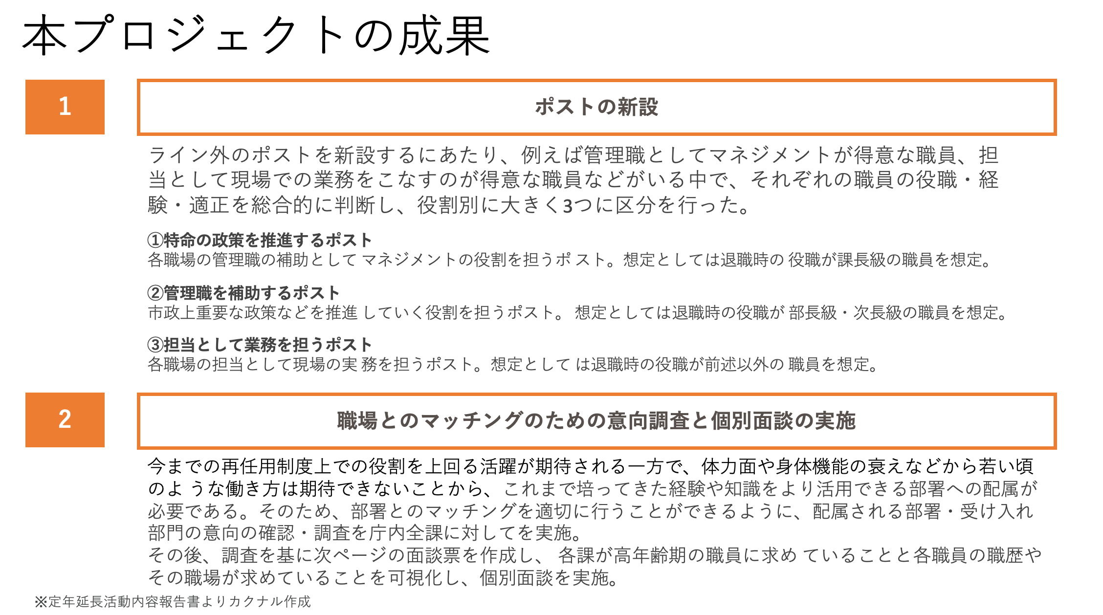 本プロジェクトは、今治市が抱える大きく2つの課題に対する施策の検討と実行です。1つめは、キャリアパス確保について。定年延長者を係長に任命すると、若い世代の職員の昇進の機会を奪わないように設けられた役職定年制の趣旨に反してしまいます。2つめは、高齢期職員(60 歳以降も働く職員)に求める役割の再定義です。現在の再任用制度では、給与の面からも一担当としての役割しか求められていませんでした。しかし、定年延長制度では、役職は係長級で処遇され、その給与の7割が保障されるため、今までの再任用制度上での役割を上回る活躍が期待されます。