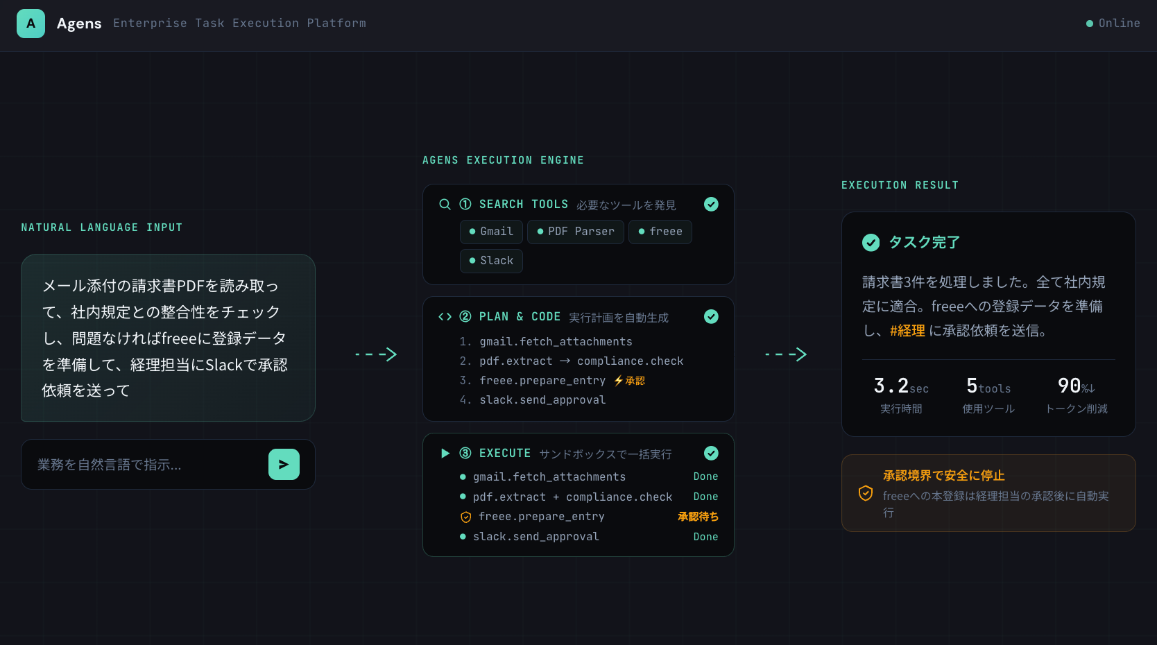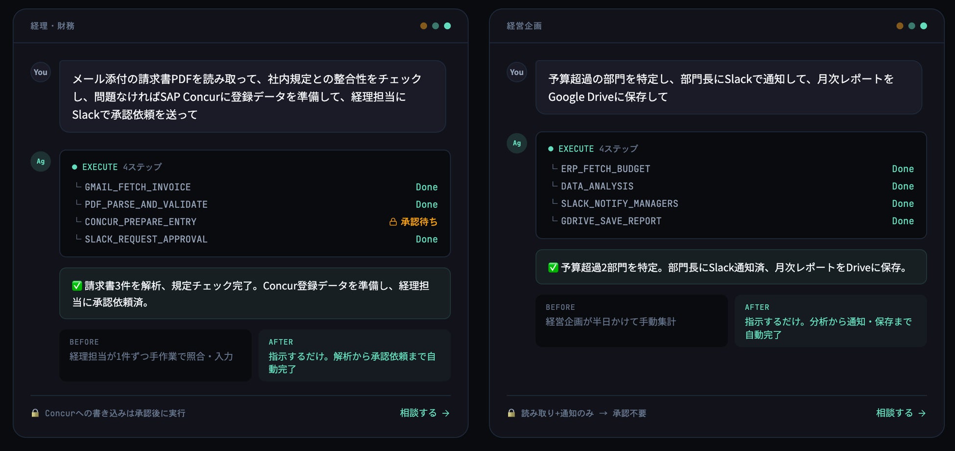 ユーザーが「メール添付の請求書PDFを読み取って、社内規定との整合性をチェックし、問題なければSAP Concurに登録データを準備して、経理担当にSlackで承認依頼を送って」と指示すると、Agensが以下を自動実行します。