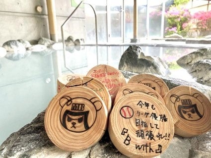 6 月 24 日は埼玉武蔵ヒートベアーズの公式キャラクターである「エンビー」の誕生日。エンビーをお祝いするイベントとして、おふろにエンビーの焼き印付きのヒノキ入浴木を浮かべます。入浴木には店舗のお客さま・スタッフ、埼玉武蔵ヒートベアーズファンのみなさまからエンビーへのお祝い・応援メッセージを記入いただきます。