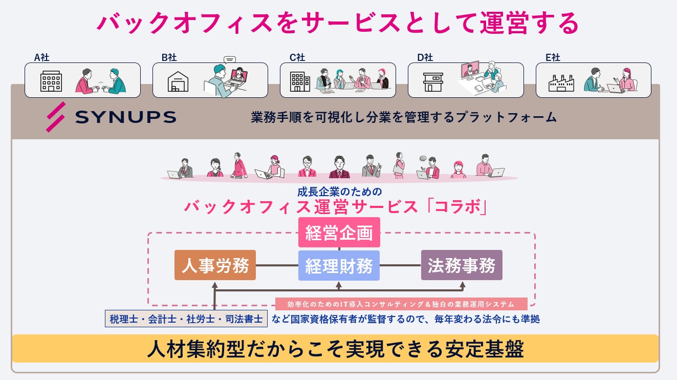 集約化・構造化・IT化の3本柱で中小・ベンチャー企業の管理部門の生産性を飛躍的に高め、大企業以上の水準で管理業務を実現します。