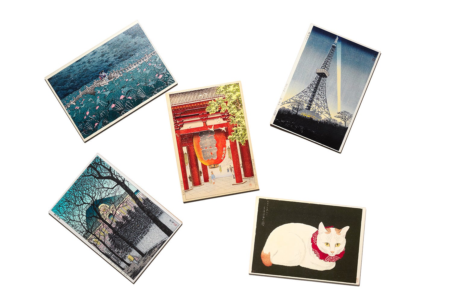 (時計回り)東京タワー、白猫、東京駅、芝弁天池、浅草観音二王門