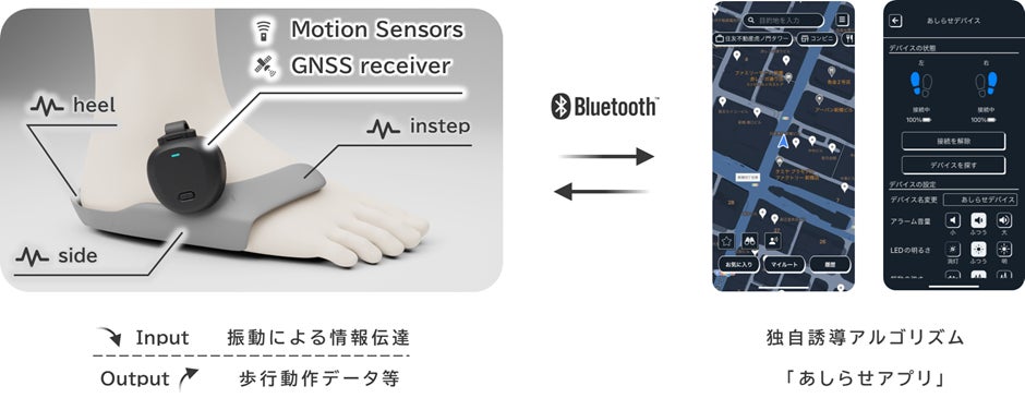 デバイスを装着した靴を履いて外出すると、足元からの振動によって目的地までのルートや曲がる方向、タイミングなどをお伝えします。また目的地設定後はスマートフォンをポケットに入れたまま利用が可能。道案内をあしらせに任せることで、視覚や聴覚を邪魔せず安全確認に集中することをサポートします。