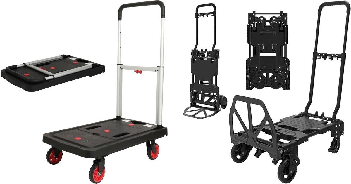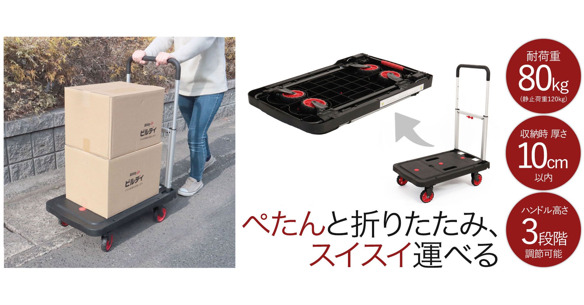 収納時は折りたためてコンパクト!ビルディプライベートブランドの折りたたみ台車「ぺたんこキャリー」「クロキャリ」の2種類を発売開始。