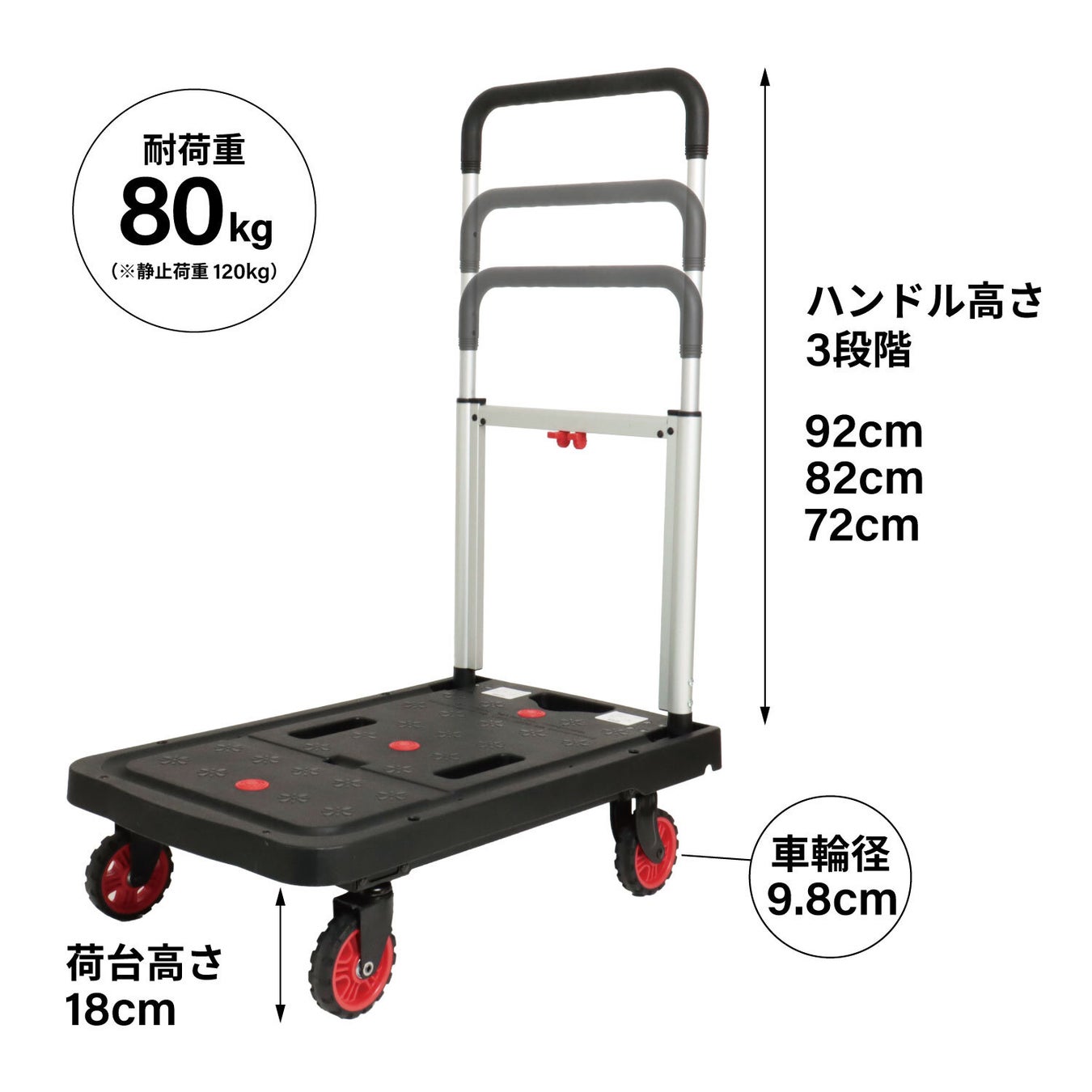 ハンドルが伸縮するので、載せるもののサイズや使う人の身長によって使いやすい高さに調節できます。