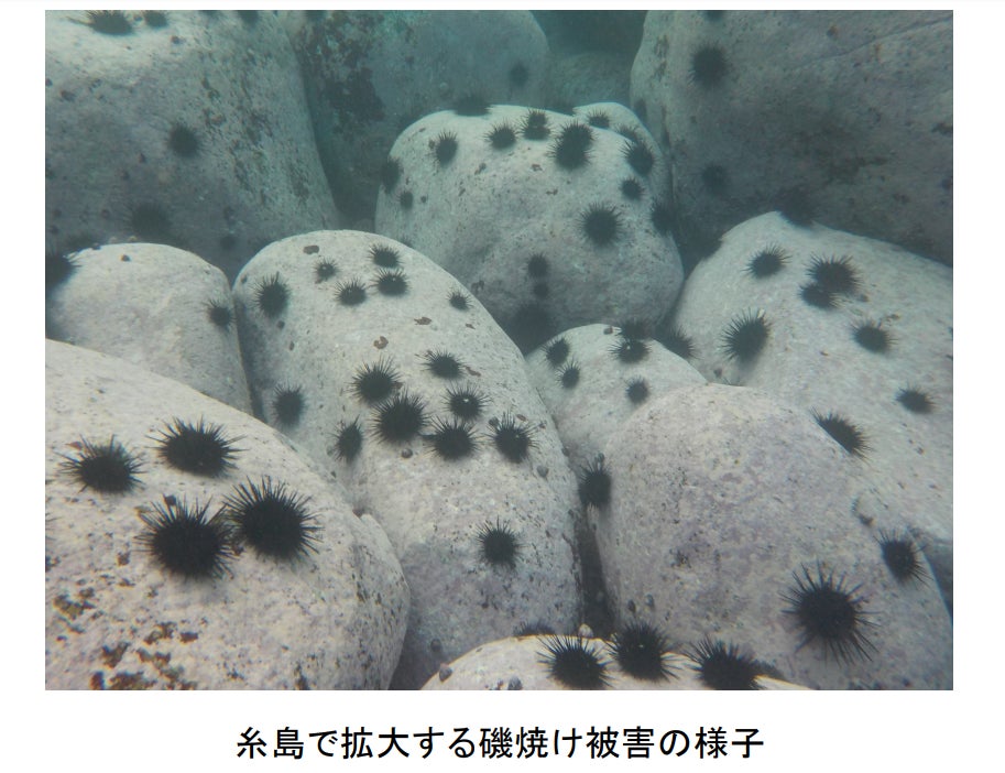 現在、糸島の海は、海の砂漠化とも呼ばれる磯焼けが問題となっています。磯焼けの原因としては、地球温暖化が進んだことで、ウニが大量発生、食害により藻場を食べ尽くしてしまっている状態となり、日本中で問題となっています。