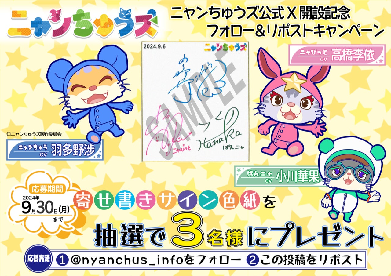 ニャンちゅうズ公式X開設記念キャンペーンでは、ニャンちゅう役 羽多野渉、ニャびっと役 高橋李依、ぱんニャ役 小川華果 の寄せ書きサイン色紙を抽選で3名様にプレゼントいたします!