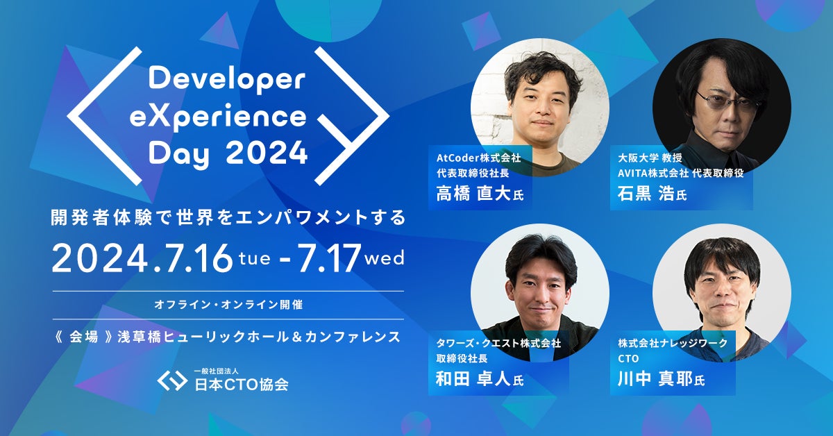 一般社団法人日本CTO協会(本社:東京都渋谷区/代表理事:松岡剛志、以下:日本CTO協会)は、2024年7月16日(火)・17日(水)に、「Developer eXperience Day 2024」をオフライン・オンラインのハイブリッドにて開催いたします。現地配信を含むハイブリッド形式で開催いたします。本日、当カンファレンスの第一弾登壇者を公開いたしました。