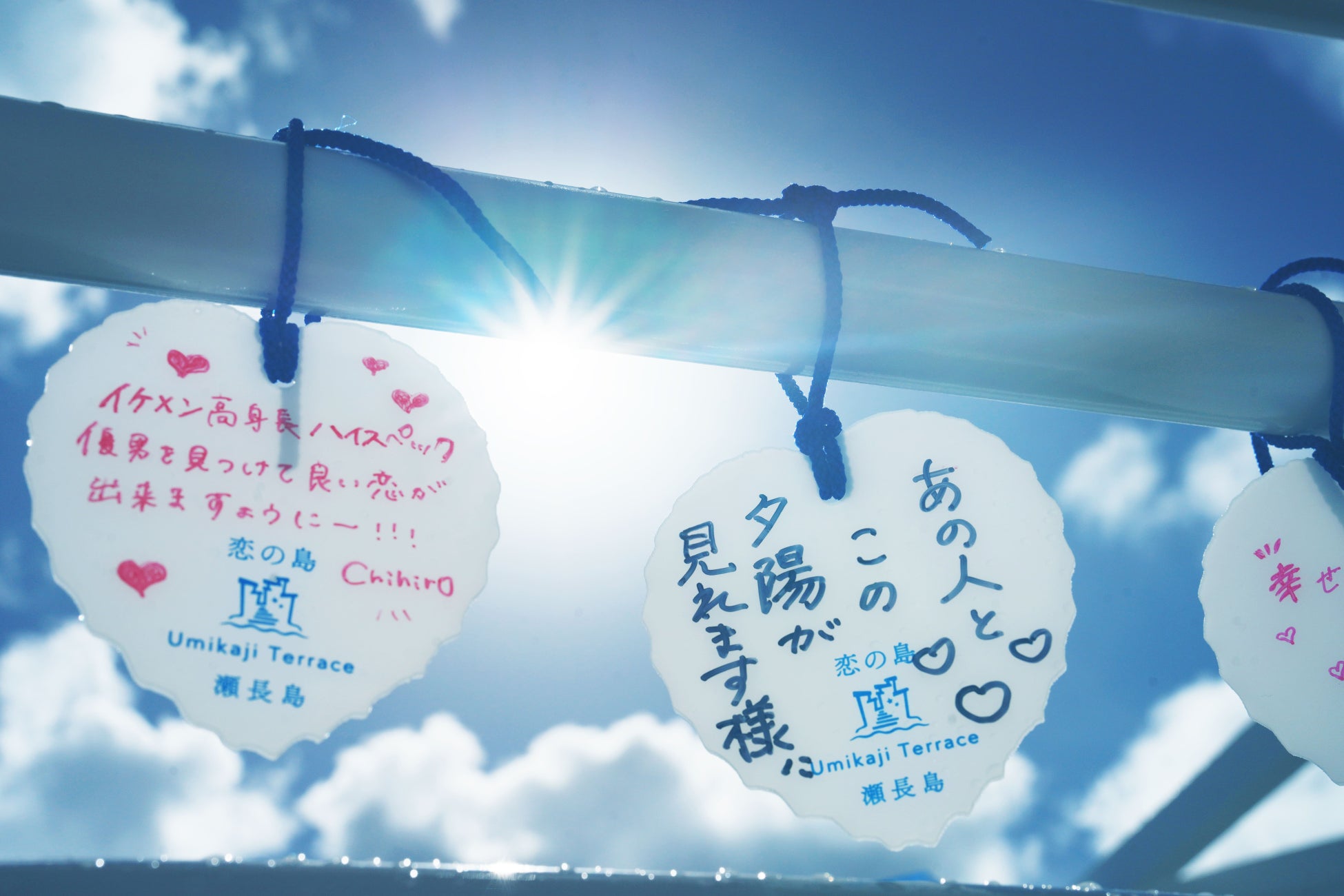 恋のパワーを来島した皆様にお持ち帰りいただくための恋愛スポットを続々新設中の瀬長島ウミカジテラス。この7月末には新たに美しい海を眺める恋のスポット『恋のテラス』が誕生。ハートの形の貝をあしらった恋のおまじない 『恋が叶う絵馬』に想いを綴ることで恋愛祈願をすることができます。