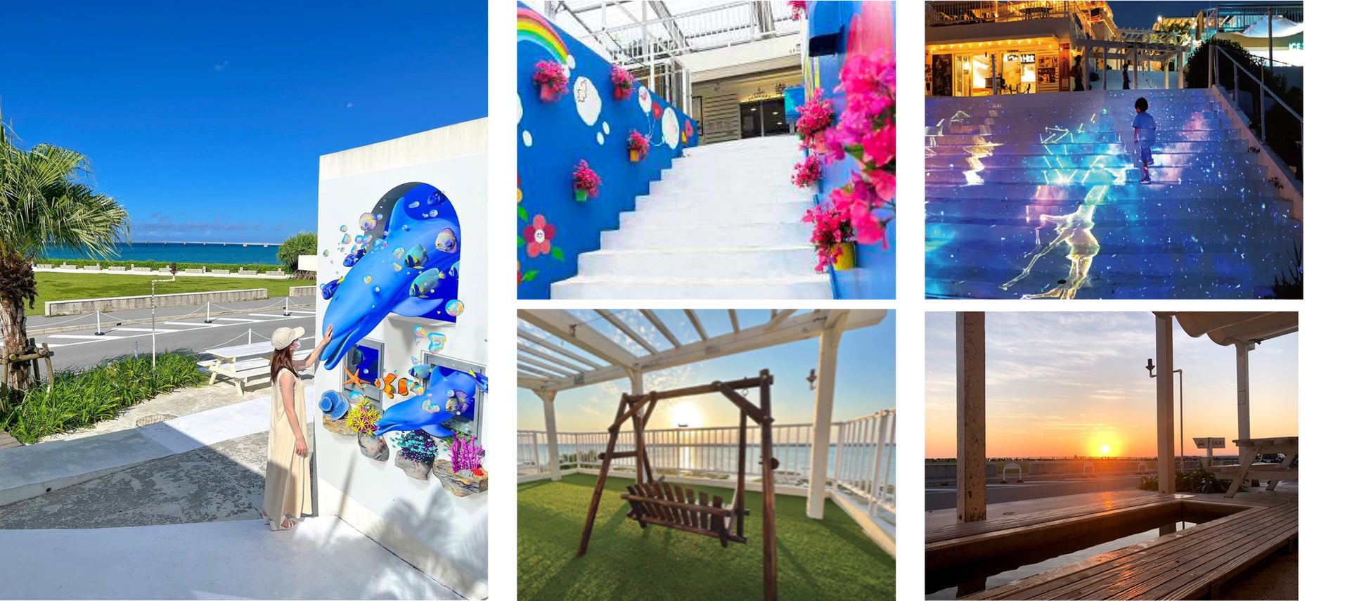 左斜め後方から撮影すると、イルカが飛び出しているように見えるトリックアート『幸せを呼ぶイルカ』や、真っ青な壁と豊見城市花のブーゲンビリアで彩られた鮮やかな幸せを呼び込む空間『ブーゲンビリアの階段』など、様々な映えるフォトスポットが集まる瀬長島ウミカジテラス。