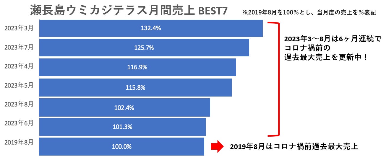 瀬長島ウミカジテラスは2023年3月度に過去最高売上記録を更新し、それを皮切りに4~8月度も、直近6ヶ月はコロナ禍前過去最大売上を記録した2019年8月度数値を超過し続けています。その中でも2023年8月度の数値は102.4%(2019年8月を100%とし、当月度の売上を%表記)となっておりますが、台風6号襲来により8月1日(金)〜7日(木)が全館休業となっており、7日間に及ぶ売上機会損失があります。当該売上機会損失額を勘案しての2019年8月対比に関しては概算で122.1%となり、未だにその人気は衰え知らずといえます。