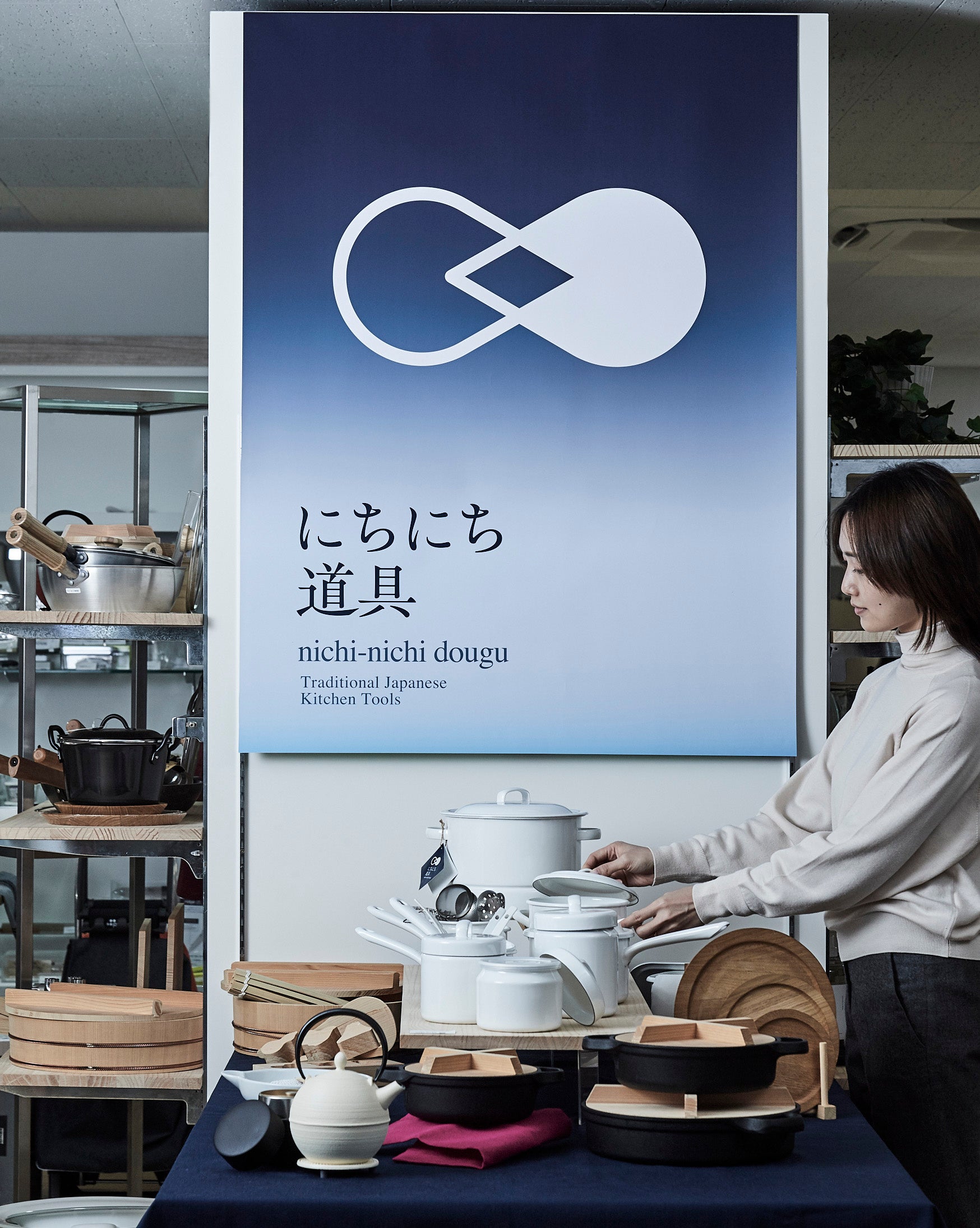 皆さまに名前を憶えてつぶやいて頂きたく、日本語を学ぶ多くの人が初めて覚えるであろう平仮名のブランド名になりました。「にちにち」という畳語の可愛らしさも好んで頂ければ。またロゴマークは料理には無くてはならない水と火を表現し、人と人が向かい合って話をしているような意匠にもなっています。