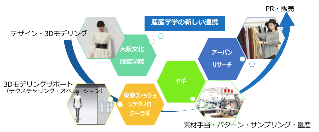 本件は、ファッションテック専門スクール「東京ファッションテクノロジーラボ(略称:TFL)」(以降TFL、代表:市川雄司 所在地:東京都渋谷区)と、繊維商社の株式会社ヤギ(以降ヤギ、代表取締役 社⻑ 執⾏役員:⼋⽊隆夫 所在地:東京都港区/大阪市中央区)、大手アパレルメーカーの株式会社アーバンリサーチ(以降アーバンリサーチ、代表取締役:竹村幸造 所在地:大阪市西区)との「産産学学」連携で実施し、3Dモデリング技術を活かした未来型のサプライチェーン構築のための '実証実験′ として位置付けています。