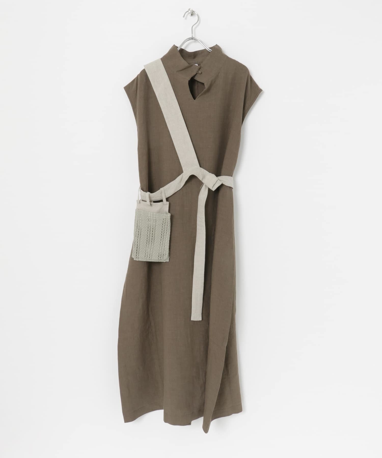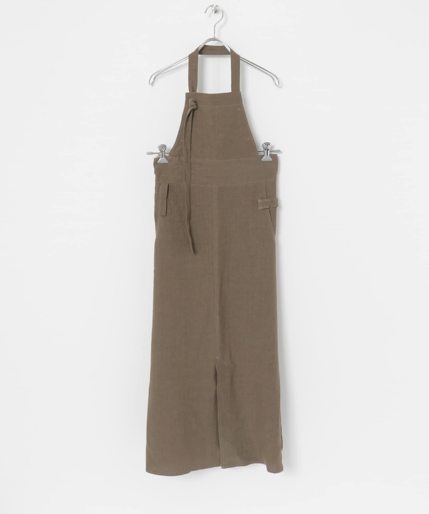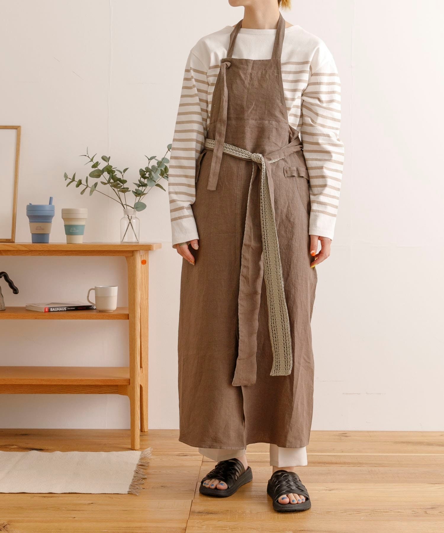 首のリボンをボタンホールに通し結んで、お好みに合わせてスタイリングして頂けます。前掛けを中に入れてカフェエプロンとしても着用可能です。ウエストベルトを長めに設定しているので体型変化の多い女性でも長く楽しんでいただけるアイテムです。