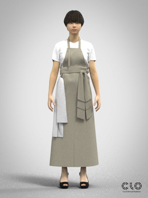 3wayの着用を楽しめるエプロンワンピース。男性でも女性でも着用可能なようにユニセックスなディテールにしています。また、胸ポケットも目立たないよう配置し、腰ポケットも深めにデザインしているので荷物がかさばらないようにしています。