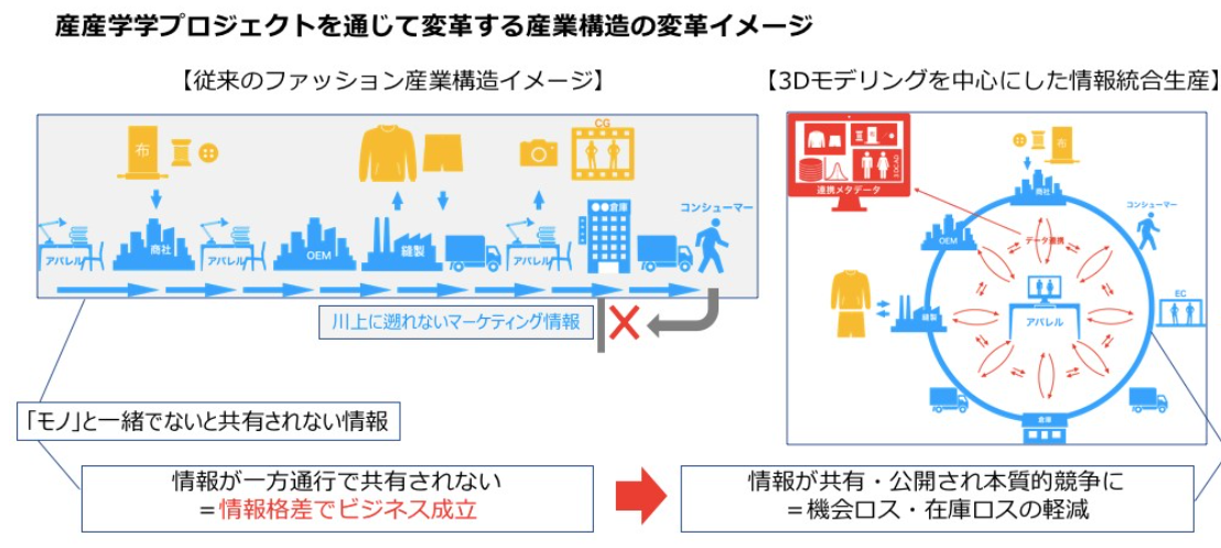 本プロジェクトは、従来のファッション産業構造を変革し、未来型のファッションサプライチェーン構築のための '実証実験′としても位置付けています。3Dモデリング技術を活⽤して、機会ロス・在庫ロスを軽減する情報統合⽣産体制を築き、クリエイターが新たな感性・デザインを生み出せる環境に最適化することについてのシミュレーションを行っています(下図)。