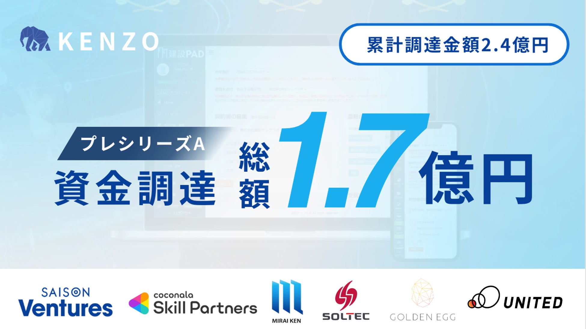 株式会社KENZO(本社:東京都港区、代表取締役社⻑ CEO:⻘木 陽)は、建設業界のDXプラットフォーム 「建設PAD」事業拡大に向け、株式会社セゾン・ベンチャーズ、株式会社ココナラスキルパートナーズ、GOLDEN EGG Ventures、ユナイテッド株式会社その他法人及び個人投資家を引受先として第三者割当増資により、アーリーラウンドの資金調達を実施しましたことをお知らせします。